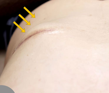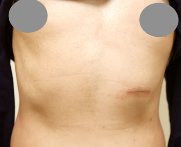 約3~5cmの傷跡が残りますが、時間の経過とともに目立たなくなります。ケロイド体質の方はケロイドが生じて残る可能性があります。