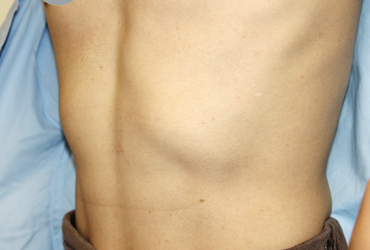 肋軟骨の出っ張りを気にされ、両側の肋骨除去術(肋軟骨除去)を行った症例です。特に張り出しの強い左右の肋軟骨4本を切除し、アンダーバストラインを整えることで、前方への突出感を改善しました。術後1カ月の時点では、術前に前へ張り出していた部分の改善がみられ、気にされていた突出についても変化がみられます。まだ術後1カ月と早期のため傷跡は目立ちますが、今後の経過とともに落ち着いていく見込みです。