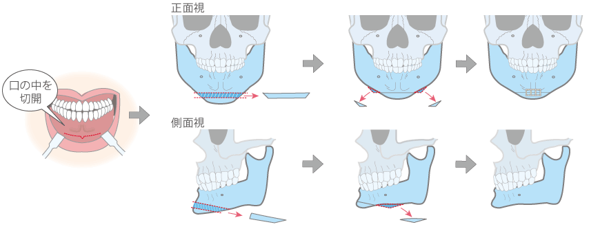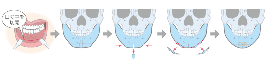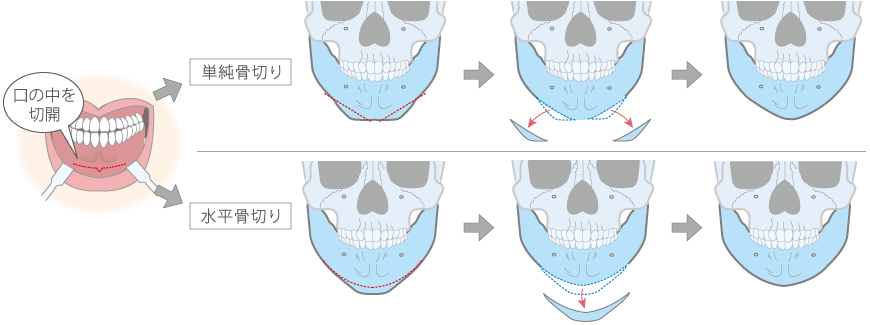 オトガイ部が正面視で少し角張っている、少し面長に見える場合に適応となります。 単純骨切りと水平骨切りの2つの方法がありますが、手術はすべて口腔内から行います。