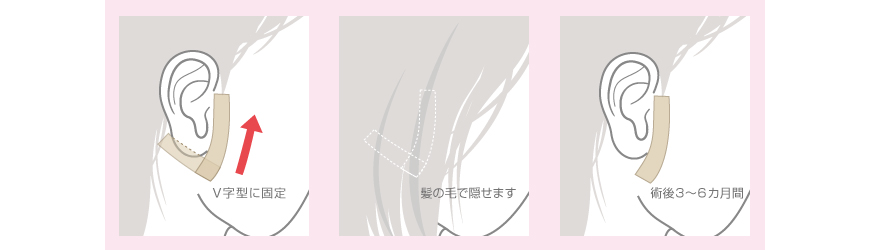 ※術後1カ月まではV字型に固定し、術後3~6カ月間は耳前部のみテープで固定します。